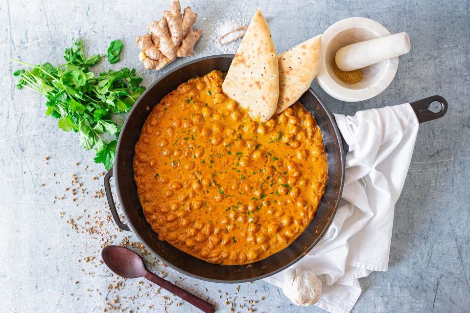 - Aggiungere i ceci con 2-3 cucchiai d’acqua, coprire e cuocere per 5 minuti, quindi aggiungere il latte di cocco e cuocere per altri 10 minuti.